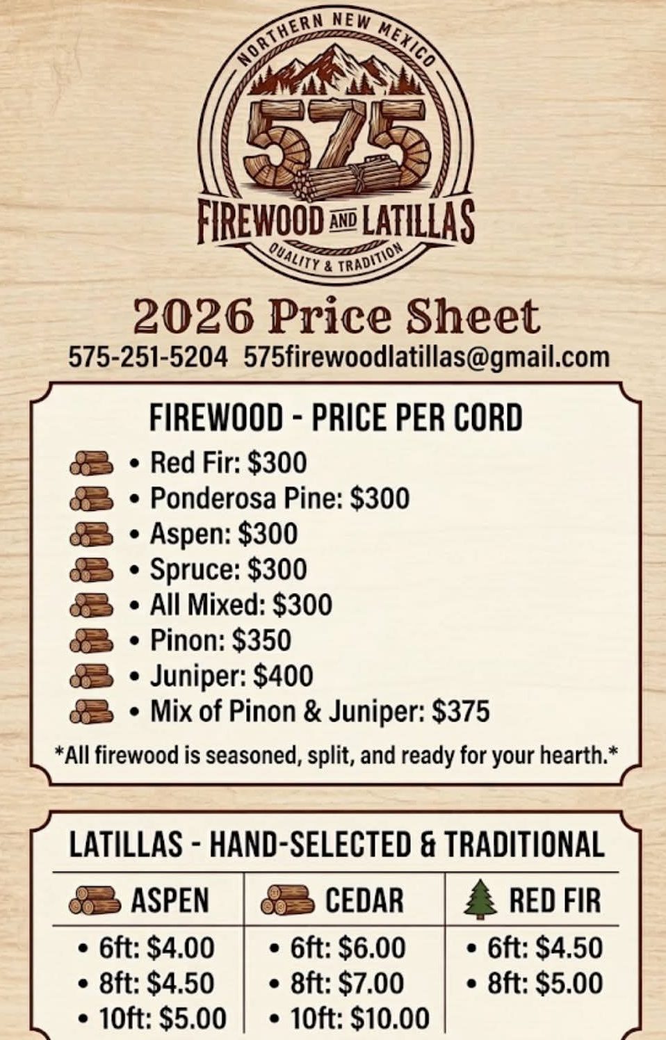 Founded in Taos, 575 Firewood and Latillas is dedicated to providing reliable, high-quality firewood and latillas to Northern New Mexico communities. Owned by Rick Valerio, we believe that your word is your bond. Our mission is to keep homes warm and properties authentic with fair pricing, honest measurements, and a deep respect for the environment and our neighbors.